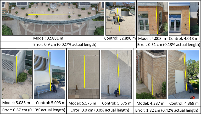 Relative accuracy measurements refer to measurements taken between objects within the model and were taken with a tape measure. Based on over a dozen samples, the average error calculated was 0.64 cm or 0.16% of the actual measurement length. Some of these measurements are shown below. These measurements give an idea of vertical accuracy better than the GPS measurements because all Ground Control and Check Points were taken at ground level.